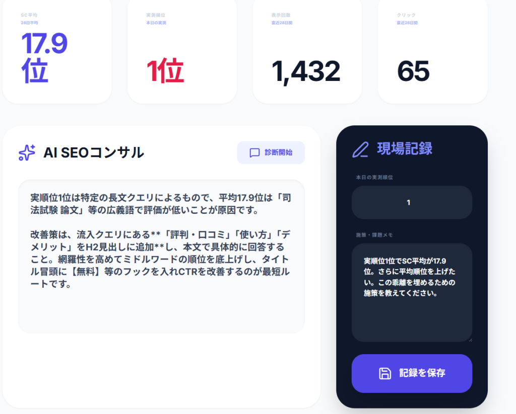 SEOを「後追い作業」から「先読み戦略」へ変える、プロのためのSEO判断アプリです。